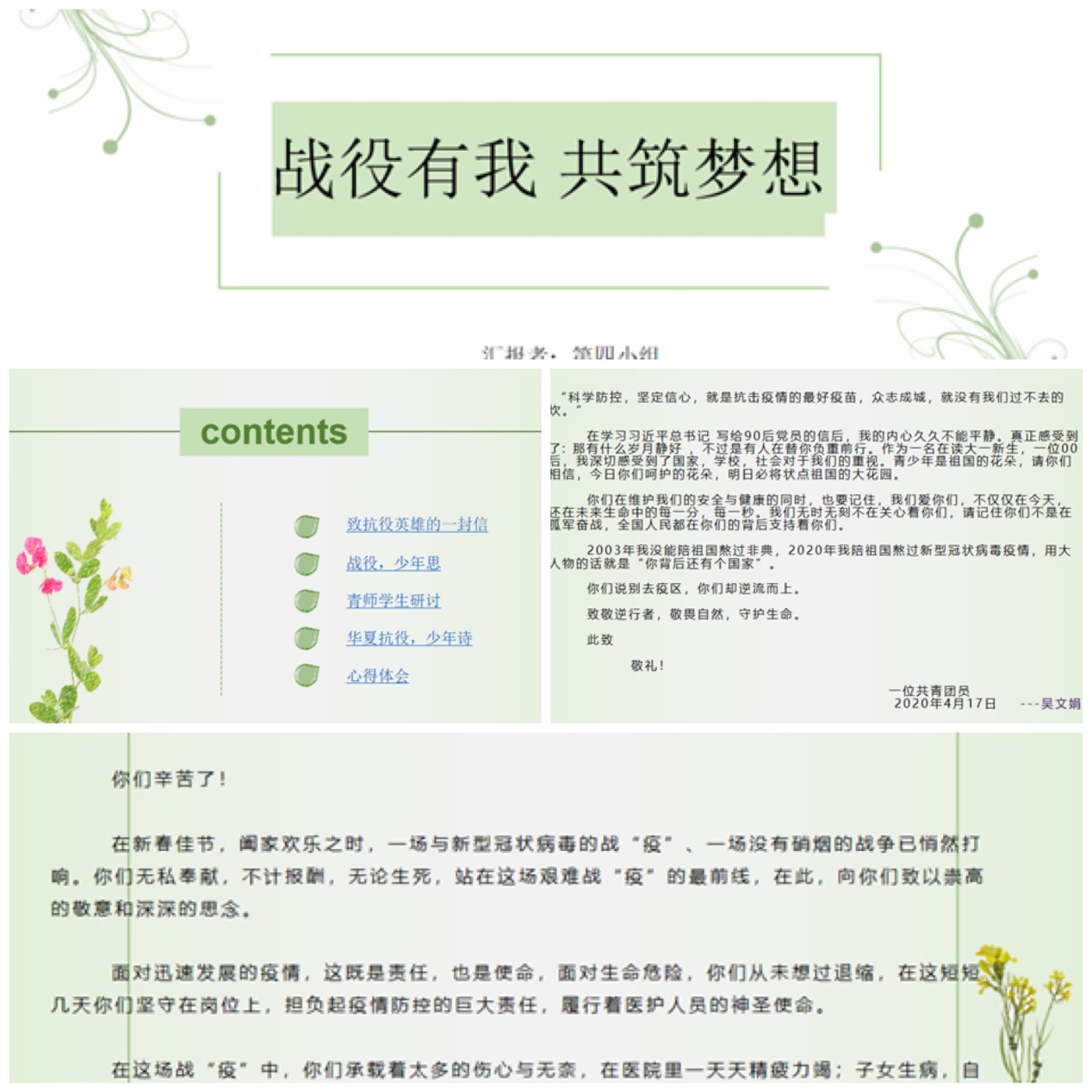 安廷龙:在这抗击疫情的阻击战中,90后、00后青年挺身而出、主动请缨,他们有的说“我是党员我必须上”,“我是单身我没有牵挂我先上”,原本他们也是只是个孩子,但他们在国家和人民需要的时候,他们毅然决然,向险而行,冲锋在前,换上隔离服他们便是“战士”,疫情一日不消,他们一日不退。他们的勇于担当、不畏艰险、默默奉献、朝气蓬勃的精神感染着我们,为缓解病人的心理压力、增进医患感情,他们在方舱医院教病人跳广场舞、为避免幼儿患者对穿着隔离服医护人员的抗拒,他们在隔离服画上了萌萌的手绘,为方便医患交流、第一时间明白患者的需求与不适,他们制作了图文并茂的交流手册,太多感人的画面与事迹,为这场抗击疫情注入了温暖的力量,他们是最可爱的人,用实际行动证明新时代青年是好样的。