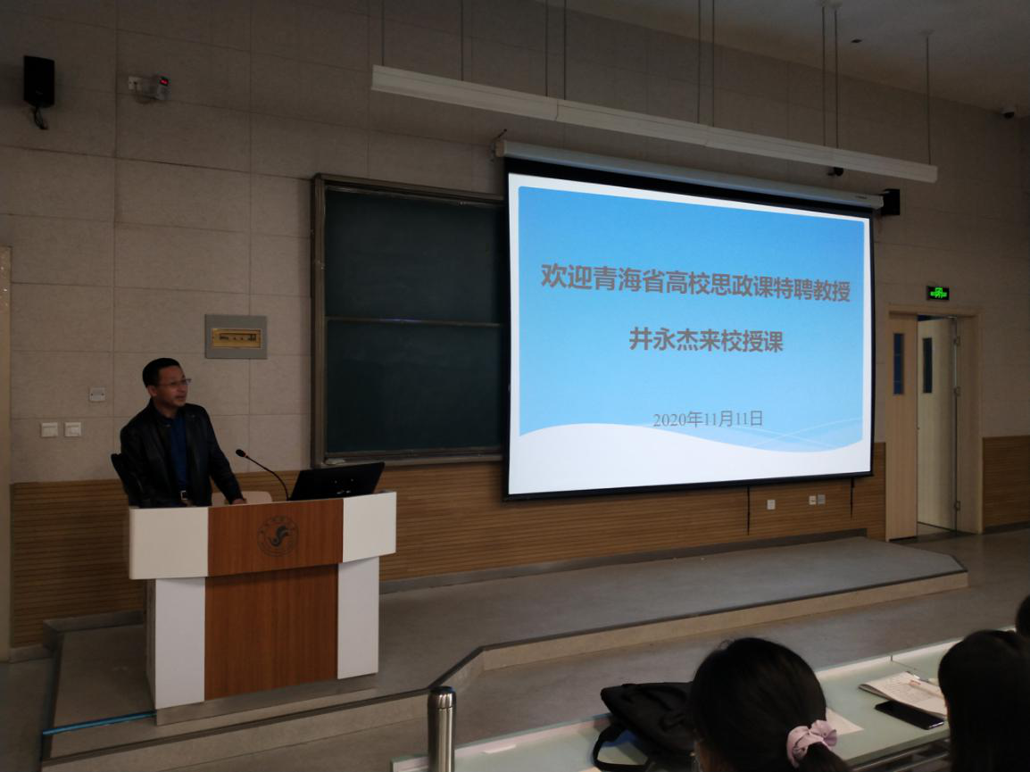 11月11日,beat365在线官网入口邀请省高校思政课特聘教授、海南州委常委、州纪委书记井永杰,走进公司《形势与政策》课堂,做了题为“一个村两个家的事”的主题讲座。18翻译、18日语及18美术学等近200名员工聆听了讲座。