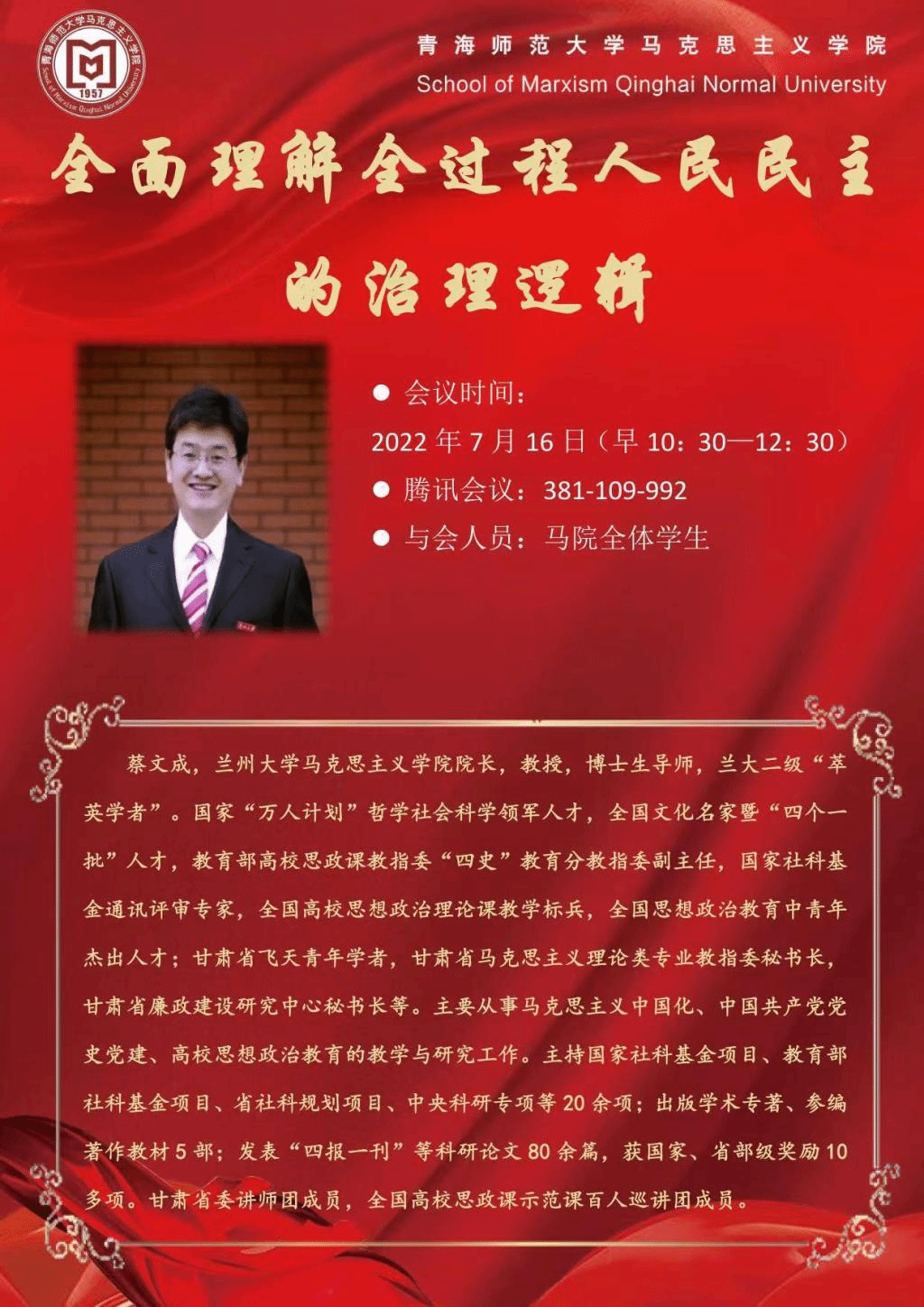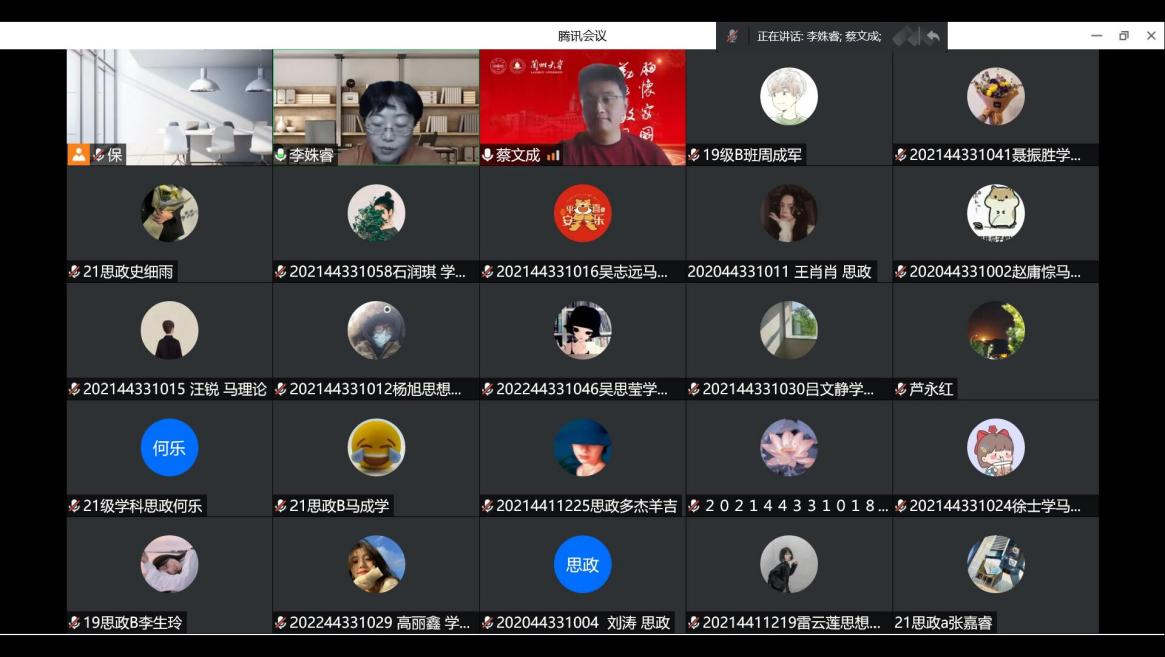 为了进一步深入推进beat365在线官网入口与兰州大学beat365在线官网入口合作交流,提高公司研究生和本科生对全过程人民民主感悟理解,特邀兰州大学beat365在线官网入口经理蔡文成教授在线上为公司学子作《全面理解全过程人民民主的治理逻辑》专题讲座。公司党总支书记李姝睿致欢迎辞,教师保积红主持会议。