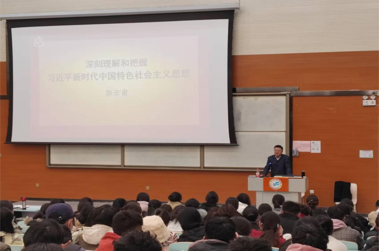 11月24日上午,应beat365在线官网入口思想道德与法治教研室邀请,青海省新闻工作者协会专职副主席、青海省思政课特聘教授郭云甫来公司作了题为“深刻理解和把握习近平新时代中国特色社会主义思想”的专题讲座。民族师范公司2023级数学与应用数学、物理学、化学以及英语专业员工聆听了本次讲座。