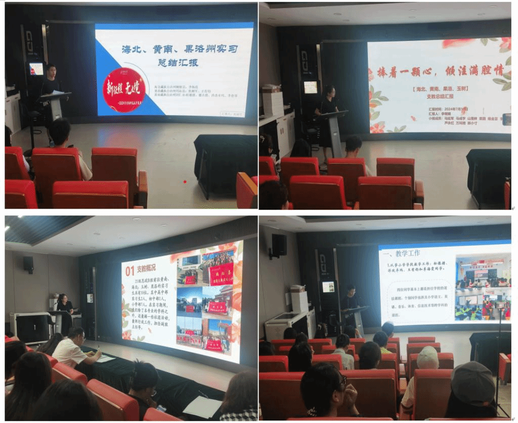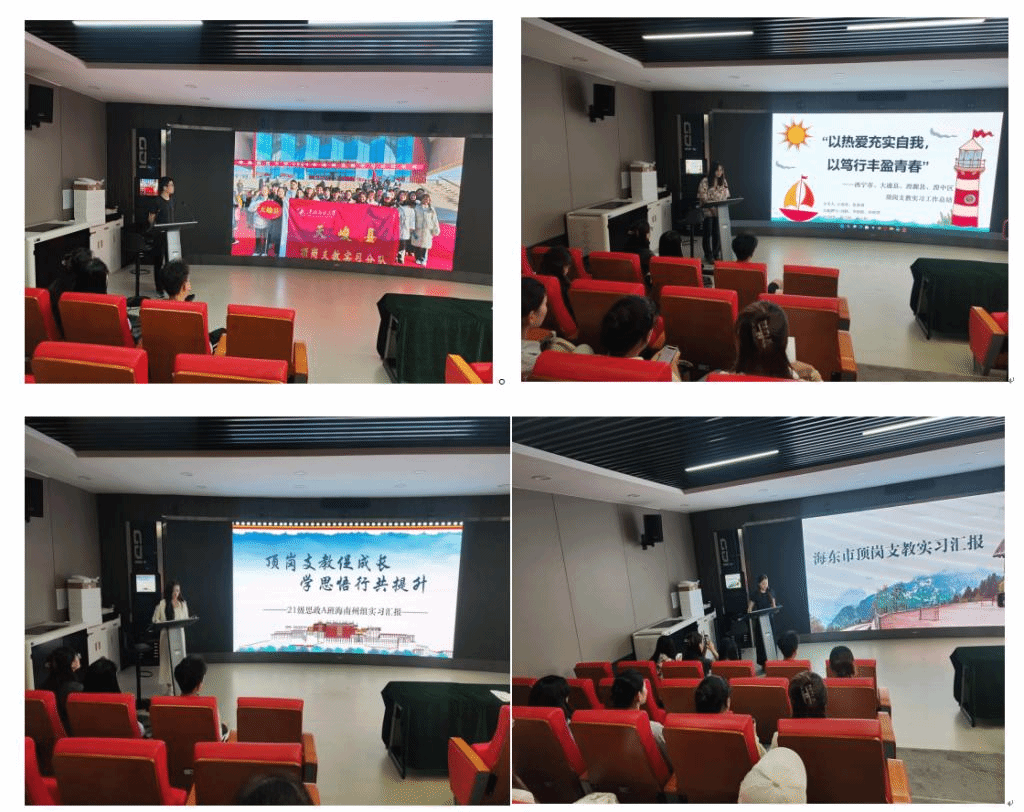 同学们围绕着各自的实习地点——西宁市、海东市、海西州、海南州、海北、黄南以及果洛州,展开了精彩纷呈的小组汇报。他们纷纷以丰富多样的形式,细致入微地讲述了自己在实习期间的教学工作。无论是课堂上的激情讲解,还是课后的耐心辅导,都展现出了对教育事业的热爱与执着。同时,他们也分享了实习期间的日常生活,从宿舍的点滴趣事到与同事们的互动交流,都充满了温馨与欢乐。
