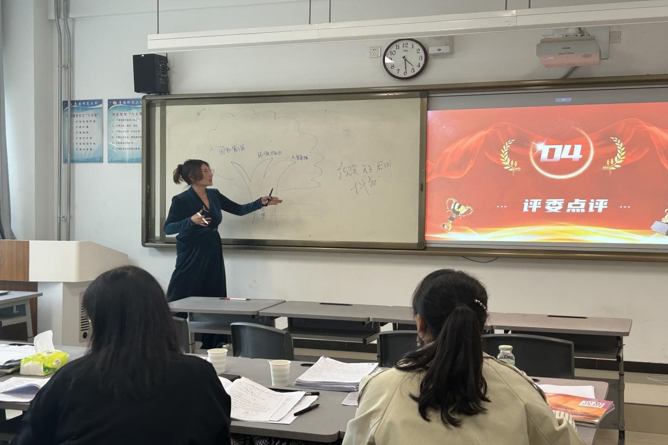 12位入围校赛的选手依照抽签顺序进行现场说课和模拟授课展示,他们从文化传承、价值创造、人生哲学等多个方面进行选题,采取多样的教学形式,以饱满的热情投入到讲课之中,充分展现公司师范生的综合素养。经过逐一展示后,各位评委综合评定,宋家蕃老师揭晓比赛结果:贾卫嘉同学获一等奖;宋国琼、马皓冉同学获二等奖;王若涵、薛莺玉、毛颖同学获三等奖。