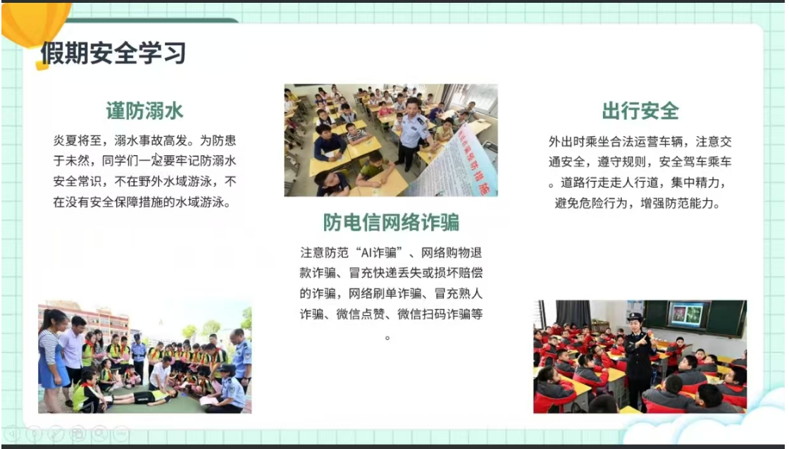 各班员工代表通过交通安全、防火防盗、应急技能、家庭安全、出行安全、网络安全等多个方面为同学们讲解安全知识。此外班主任强调离校前需妥善保管好个人物品,做好寝室卫生,外出应结伴而行,防止意外发生。
