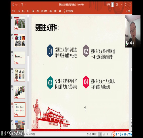 为弘扬践行爱国主义精神,发挥党员干部的先锋模范作用,4月10日,beat365在线官网入口研究生党支部依托腾讯会议平台,开展视频直播线上支部书记讲党课活动。支部书记查晖芳以“厚植爱国情感,凝聚中国力量——战‘疫’中的爱国情民族魂“为主题,化疫情危机为教育契机,为支部全体党员和积极分子上了一堂别开生面的党课。