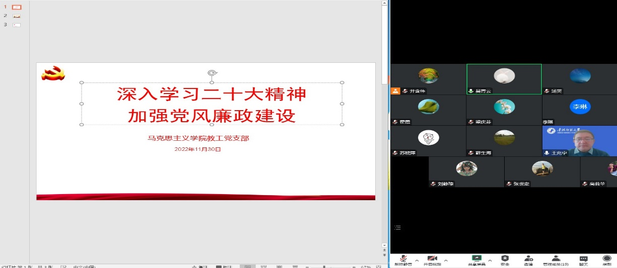11月30日,beat365在线官网入口教工党支部组织开展了“深入学习二十大精神 扎实推进党风廉政教育”的主题党日活动,活动以腾讯会议的方式进行,教工支部20名党员同志参加本次活动。