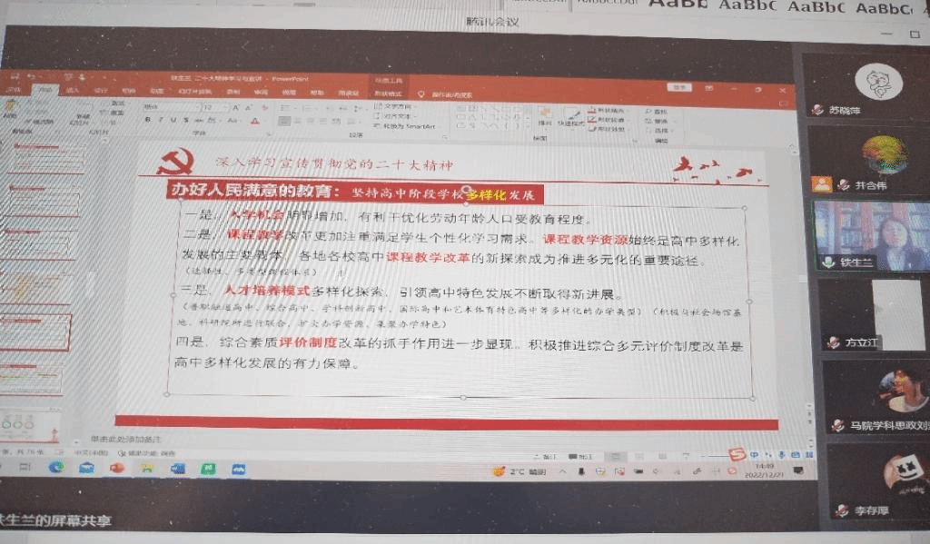 铁生兰教授以“发展”为切入点,结合工作实际,从“教育是国之大计、党之大计”“办好人民满意的教育”“以人民为中心发展教育,促进教育公平”“推进教育的数字化 建设全民终身学习学习型社会 ”等内容进行了详细解读,主题鲜明,重点突出,讲解清晰,加深了师生对二十大精神的深刻理解。