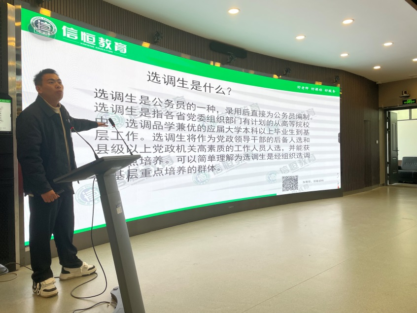 解读会上,信恒教育肖老师根据2024年青海省选调生公告和报考指南对何为选调生、选调生招考与公务员省考的区别、近五年考情分析以及选调条件、程序及注意事项等进行了详细介绍。陈老师结合公司、公司具体选调生工作开展进行了补充。三位老师针对同学们关心的关于校级以上奖励、员工干部的界定以及考试、选岗等问题,都进行了更为详细的解答。