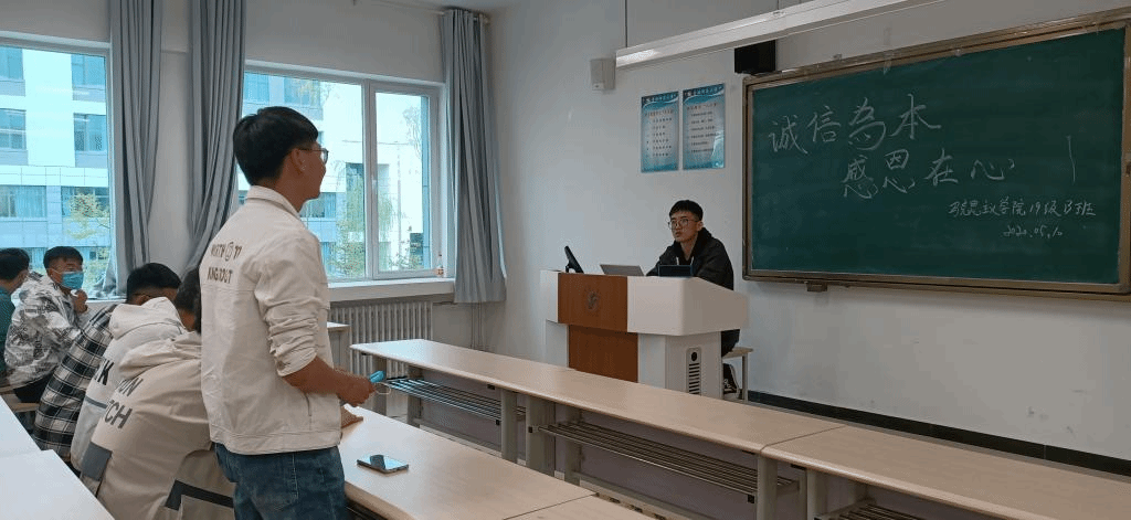 首先,邢忠义同学讲述什么是诚信,分享了有关诚信的古今中外的经典格言。之后,同学们围绕“诚信”展开互动,赵智强同学分享如何成为一个诚信的人。恰逢母亲节,班会主题又设置感恩的内容,有四位同学分享了平日里与母亲生活的点滴,回忆与母亲在生活中的美好与摩擦,同学们有感恩也有愧疚。最后,邢忠义同学对班会进行了总结,希望同学们诚信为本,常怀感恩之心。