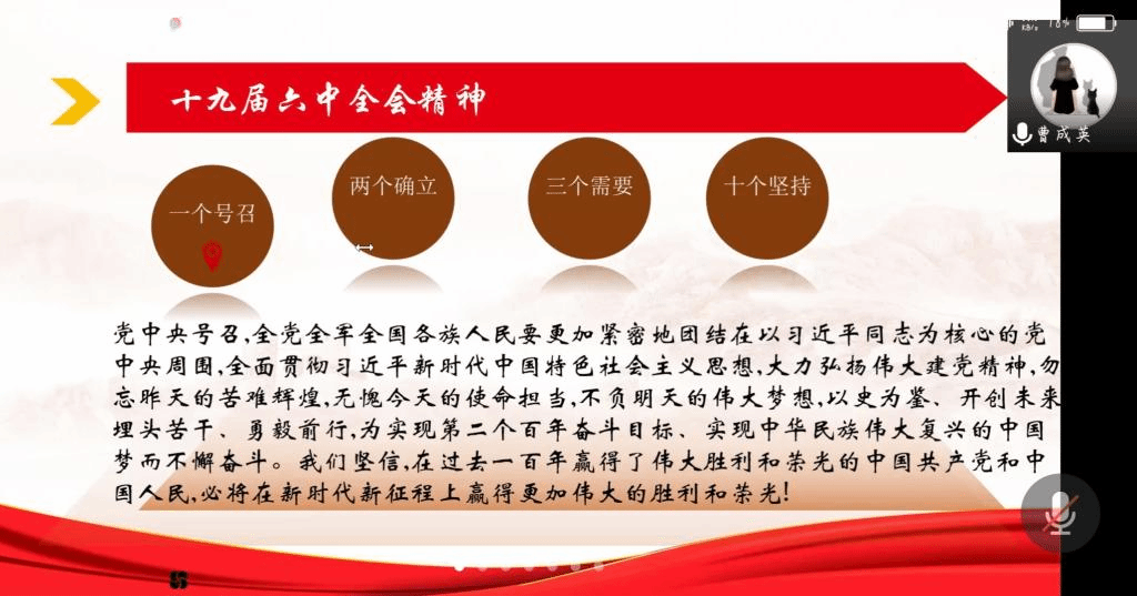 2021年11月12日上午,中共中央举行新闻发布会,介绍了党的十九届六中全会精神,为了带领广大青年员工深入学习党的十九届六中全会精神,担当民族复兴的伟大使命,beat365在线官网入口于2021年11月28日在线上开展了主题为“深入学习党的十九届六中全会精神”团学活动,此次团学活动由各班团支部书记主持召开。