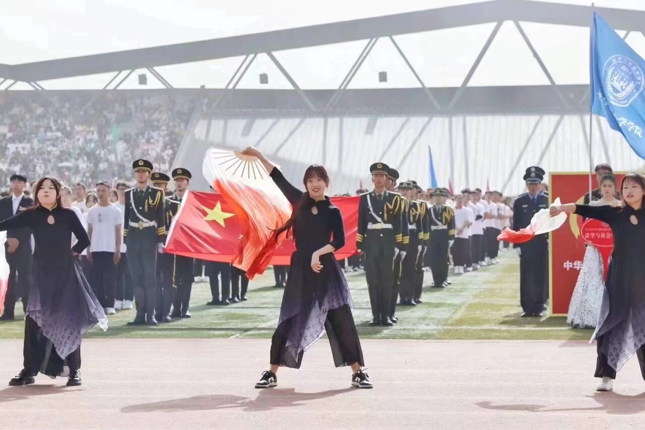 开幕式上,公司方队高举院旗,喊着“斗志昂扬、青春激昂,祖国有我!马院马院,朝气蓬勃”的响亮口号,昂首阔步走向主席台。一分钟展示舞蹈中,宋国琼等八位同学以欢快的旋律、矫健的舞姿和丰富的肢体语言演绎了歌曲《九州同》,展现了中国大地的繁荣昌盛和多元文化的魅力。