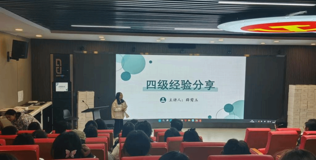 接着,高银萍同学分享了自己在学习及应对考试中的经验与技巧。薛莺玉同学分享了英语四六级报名注意事项及答题方法。